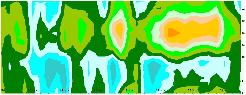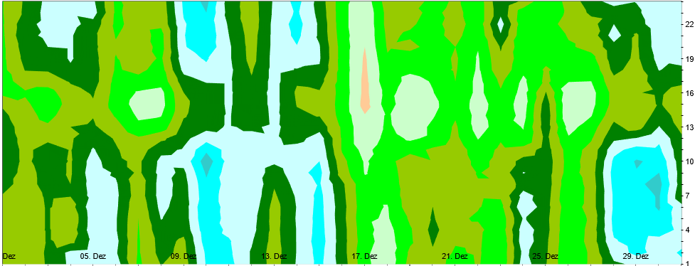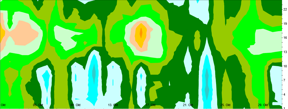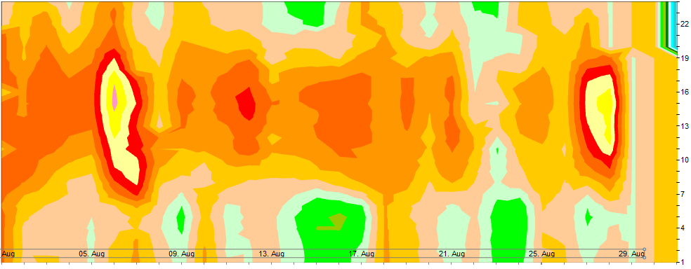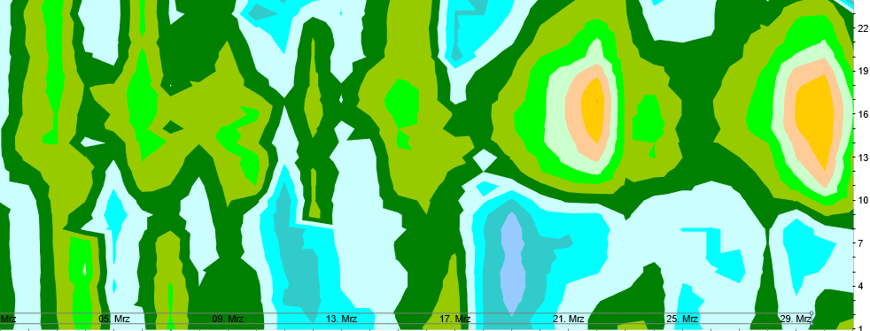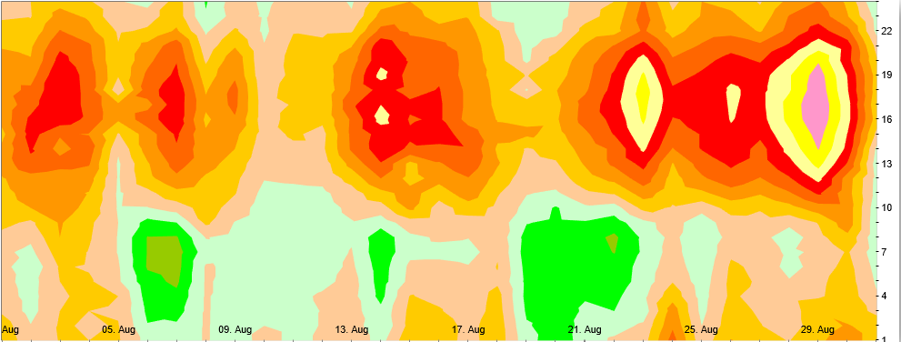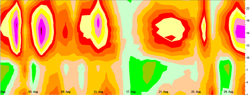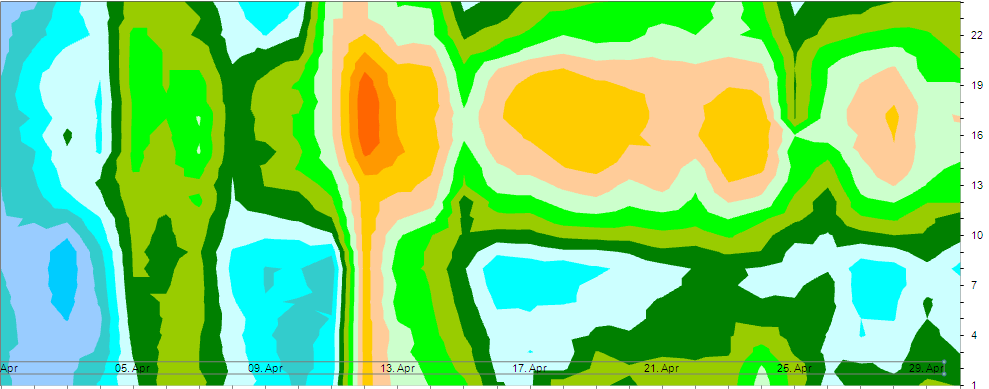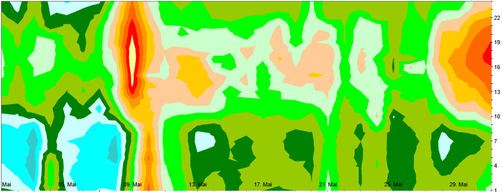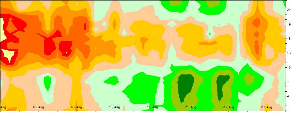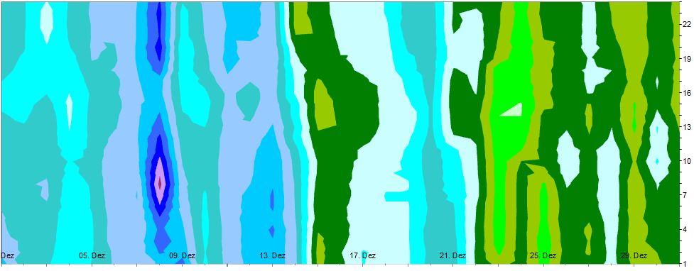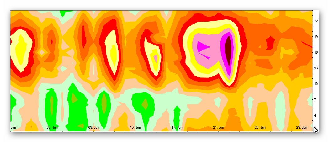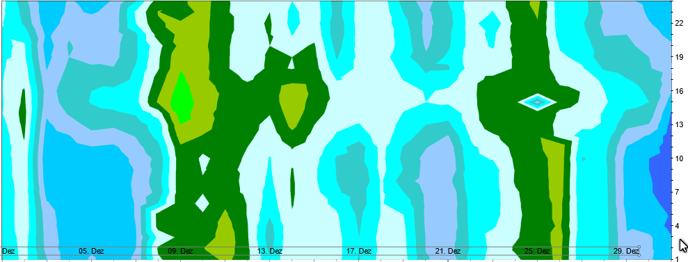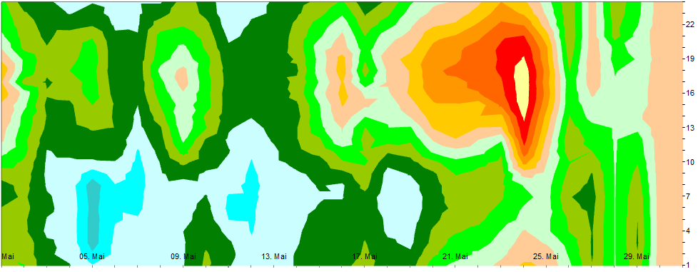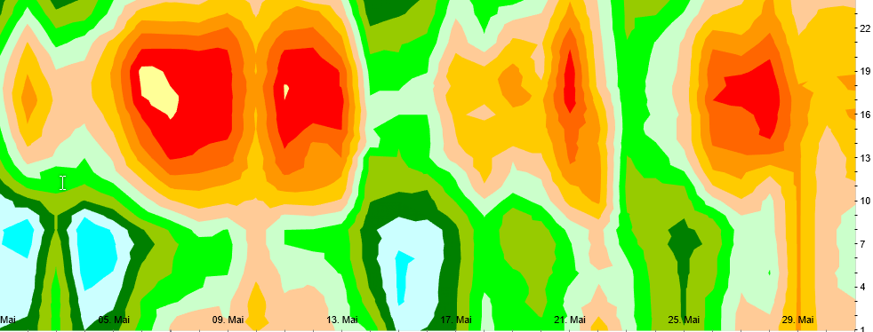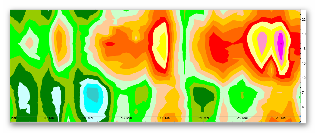 Isoplethendiagramm (Linien gleichen Zahlenwertes einer Größe) dienen dazu, um z. B. bei einem Thermoisoplethendiagramm die Tages- sowie die Jahresschwankungen der Lufttemperatur in einem Diagramm festzuhalten. So können Kälte- und Wärmeperioden schneller gedeutet werden. Durch die farbliche Abgrenzung der Isoplethen sind jahreszeitlich bedingte Veränderungen sichtbar. Wie werden die Diagramme erstellt bzw. was ist die Grundlage dieser. Es werden die Temperaturwerte zu jeder vollen Stunde eine Tages gesammelt und dies den ganzen Monat. Daraus wird dann diese Diagramm erstellt