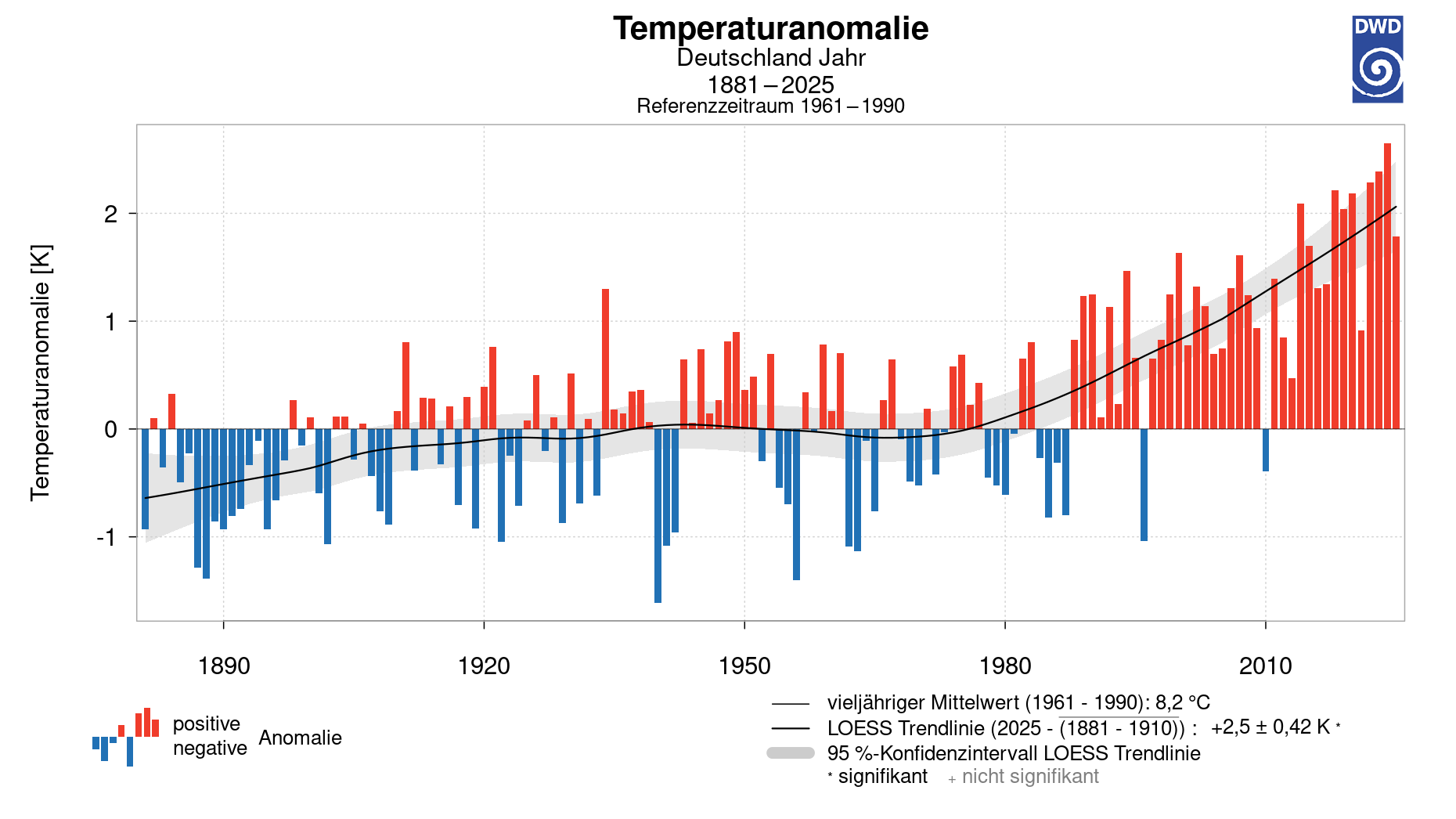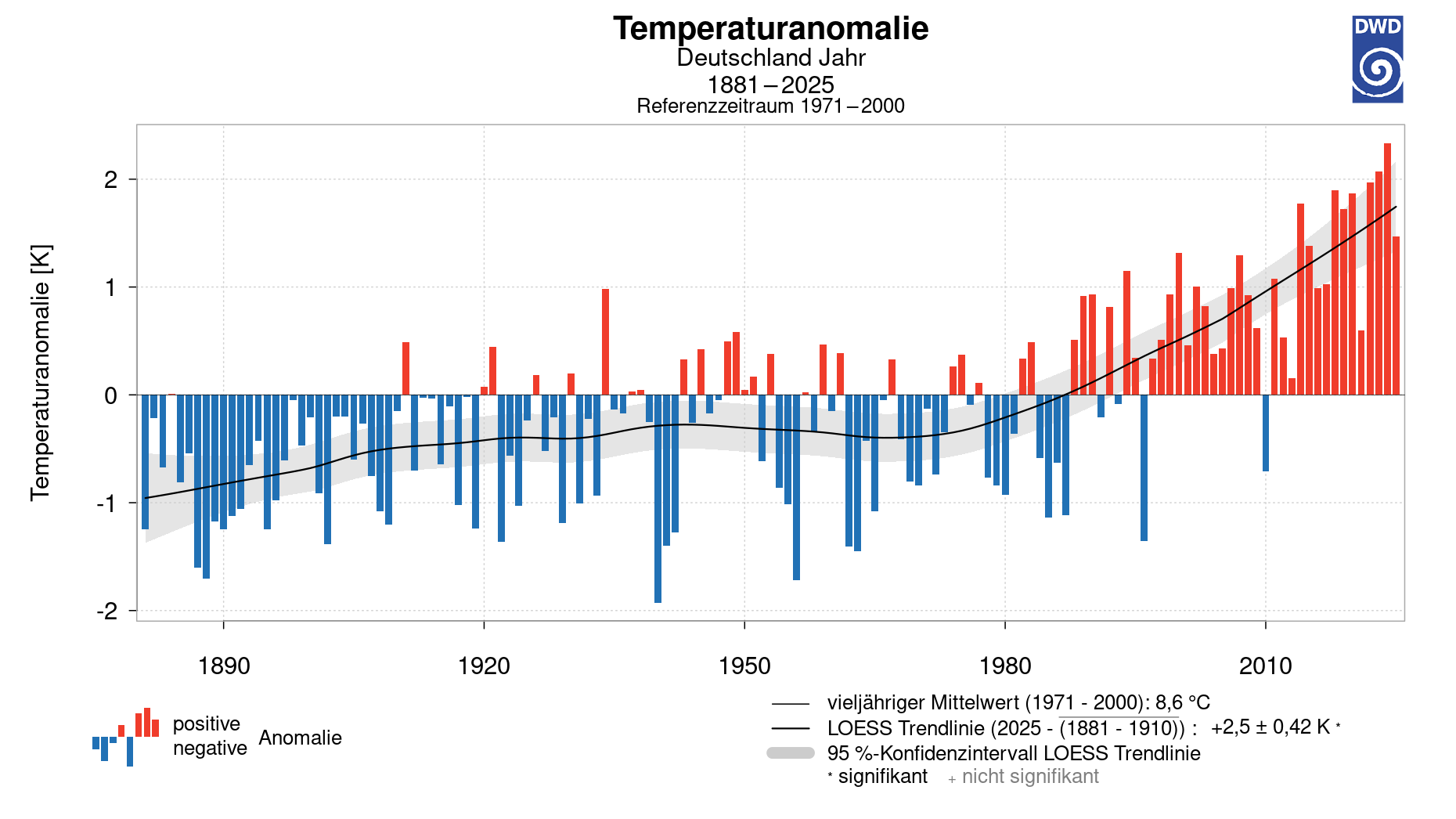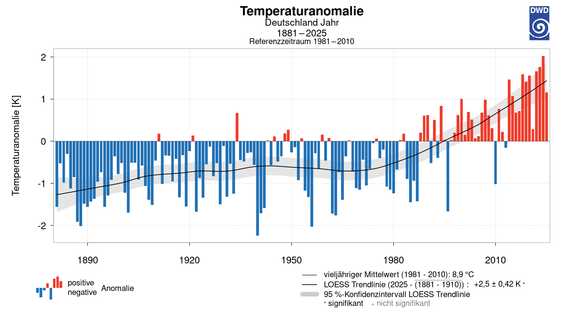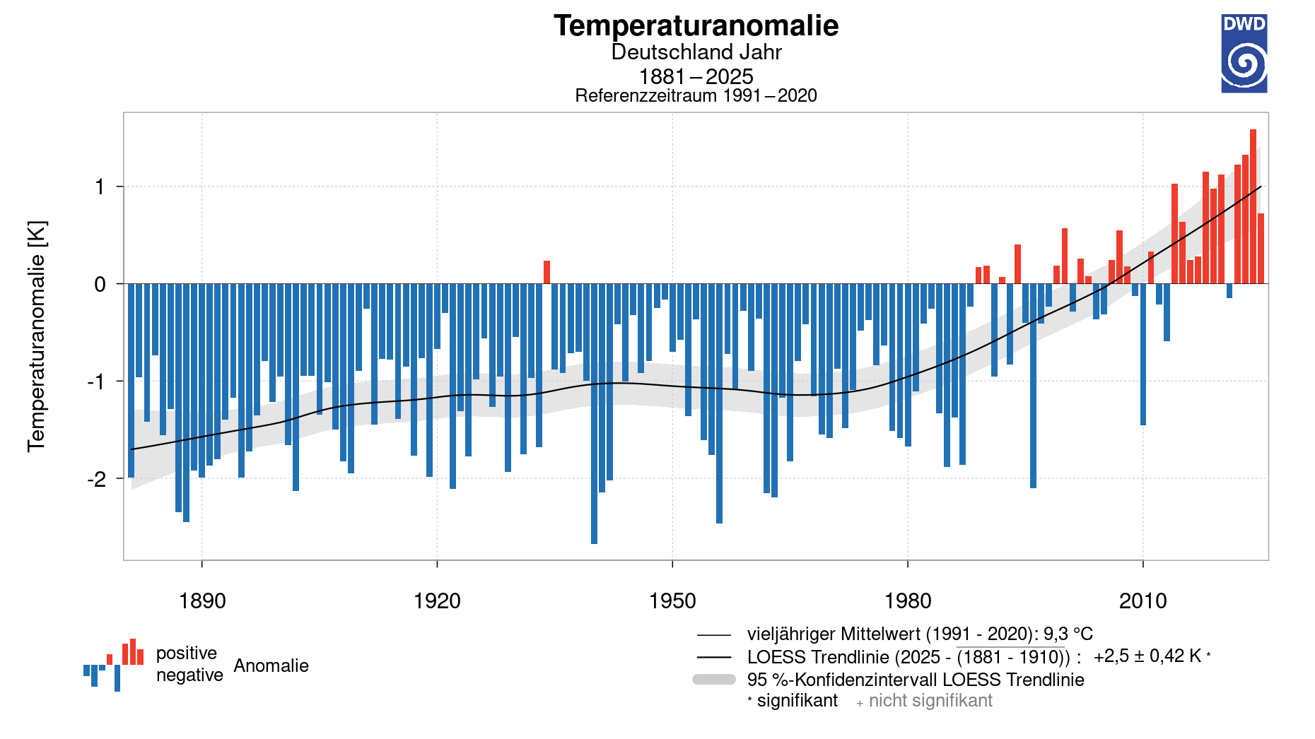 Abweichung der Jahresmitteltemperaturen vom vieljährigen Mittel seit 1881